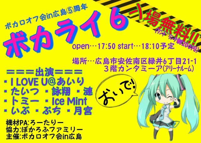 来る、2016年5月14日(土)にボカロオフ会in広島5周年記念ライブ 通称【ボカライ6】が開催されます! 今年も豪華出演者で盛り上がること間違いなしです。 当日混雑の場合は入場制限を行う場合があり、 ご観覧頂けない事がありますので早めのご予約をお願い致します。 また、当日はペンライトをご持参くださいますようお願い致します。 【ライブ詳細】 *出演者* I LOVE U@あいり Ice Mint いぶ 詠翔 漣 たいつ 月宮 トミー ぷち *会場* 広島市安佐南区緑井 フィエラ ディ プローバ三階 カンタミーア様 (アリーナル