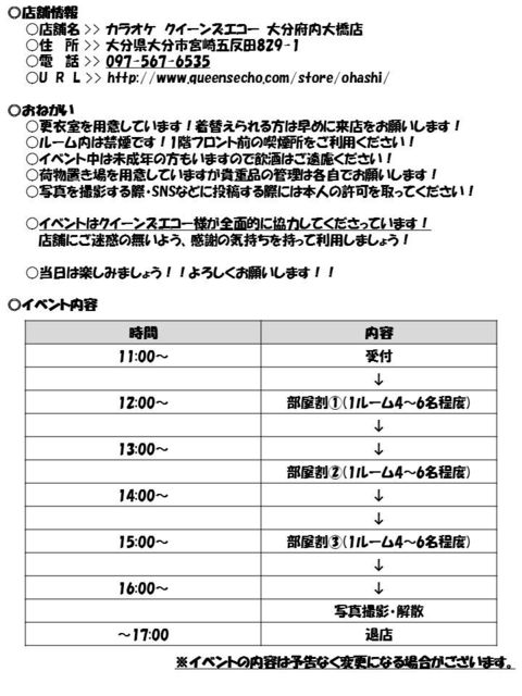 【3/29追記!!】 参加表明の際に会員カードを 持ってるか持ってないかも 記入お願いします! また、持ってない方は会員カードの発行を 希望か希望しないかも記入お願いします! −−−−−−−−−− 「例1」 こーえい参加希望です! 会員です! 「例2」 参加希望しますー。 会員カード欲しいです。 などなどよろしくです! −−−−−−−−−− どーもです! 幹事のこーえいです ! アニカラ4期を開催します! ◎日時 2016/5/15(日) 12:00〜17:00(受付は11:00〜) ◎会場 店舗
