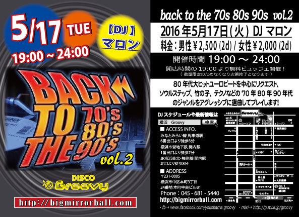DISCO Groovy 5月の第3火曜日は!80年代大ヒットユーロビートを中心にリクエスト、ソウルステップ、竹の子、テクノなどの 70年 80年 90年代のジャンルをアグレッシブに選曲してプレイします! 【DJ マロン】 【開催時間】 19:00〜24:00 【料金】 男性:¥2,500/2Drinks+ビュッフェ 女性:¥2,000/2Drinks+ビュッフェ (ビュッフェは数量限定のため無くなり次第終了となります。ご了承ください。)