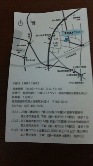 ¥Í¥Ã¥È¤Ç¸«¤Ä¤±¤¿¤Ä¤Ä¤¸¥öµÖ±Ø¤Î¥Ô¥¢¥Î¤òÂߤ·ÀÚ¤ê¤Ç¤¤ë¥«¥Õ¥§¡ÖTAK TAK¡×¤ËºòÆü²¼¸«¤Ë¹Ô¤Ã¤Æ¤¤Þ¤·¤¿¢ö »öÁ°¤Ë³Îǧ¤·¤¿¤È¤³¤í¡¢¤Ä¤Ä¤¸¥öµÖ±Ø¤ÎË̸ý¤è¤ê¿¼Âç»û¹Ô¤¤Î¥Ð¥¹¤¬½Ð¤Æ¤¤¤ë¤Î¤Ç¡¢¥Ð¥¹¤Ç¹Ô¤Ã¤¿Êý¤¬¤¤¤¤¤È´«¤á¤é¤ì¤Þ¤·¤¿¤¬¡¢¤Ä¤Ä¤¸¥öµÖ±Ø¤è¤ê25ʬ¤Û¤ÉÊ⤤¤Æ¹Ô¤Ã¤Æ¤¤Þ¤·¤¿¡£ ´×ÀŤʽ»Â𳹤ˤ¢¤ê¡¢Å¹Æâ¤Ë¤ÏÁÇŨ¤Ê¥Ù¡¼¥¼¥ó¥É¥ë¥Õ¥¡¡¼¤¬¤¢¤ê¡¢ÁÇŨ¤ÊÄí¤òį¤á¤Ê¤¬¤é¡¢¥·¥ç¥Ñ¥ó¤Î¥Î¥¯¥¿¡¼¥ó2ÈÖ¤òÃÆ¤¡¢Ìþ¤µ¤ì¤Þ¤·¤¿ http://tabelog.com/tokyo/A1326/A132601/13143504/ 4/10¤Ë¥³¥ó¥µ¡¼¥È¤¬ºÅ¤µ¤ì¤ë¤³¤È¤òÃΤꡢÁᮿ½¤·¹þ¤ß¤Þ¤·¤¿¡£