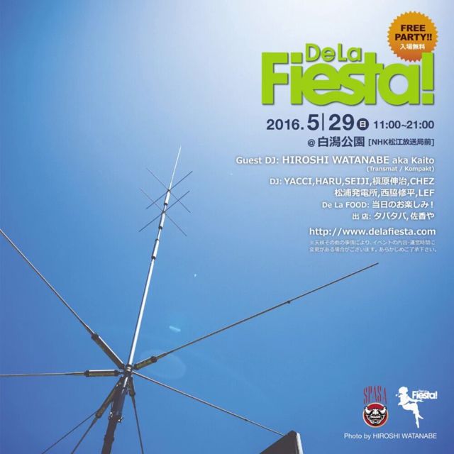 普段、夕陽を見る為に時間を待ってる事ってあんまりないですよね? 音楽と夕陽のきれいさと、色んな物が重なり合って自然と涙が出てしまう事もあります。 今回はGuest DJ に HIROSHI WATANABE aka Kaito !!!!! De La Fiesta! に1番相応しいDJです!!! 5/29(日)は、素晴らしい音楽と共に、宍道湖の夕陽を堪能しませんか? 今日の夕陽は、今日楽しむしかない! 同じ夕陽は2回とありませんから♪ 久々に会う友人や知人も多いと思います! 【タパタパ】と【佐香や】の出店ブースもあるのでお楽しみに!! FREE PARTYなのでぜひ遊びに来て下さ