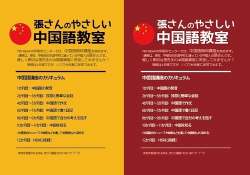 YEFJapan¤ÎÁá°ðÅÄ¥»¥ó¥¿¡¼¤Ç6·î¤«¤éÃæ¹ñ¸ì̵ÎÁ¹ÖºÂ¤ò»Ï¤á¤Þ¤¹¡£¹Ö»Õ¤Ï¡¢¸½ºß¡¢Áá°ðÅÄÆüËÜ¸ì³Ø¹»¤ËÄ̤äƤ¤¤ëÃæ¹ñ¿Í¤ÎÄ¥¤µ¤ó¤Ç¤¹¡£Í¥¤·¤¯¿ÆÀÚ¤ÊÄ¥ÀèÀ¸¤ÎÃæ¹ñ¸ì¹ÖºÂ¤Ë»²²Ã¤·¤Æ¤ß¤Þ¤»¤ó¤«¡©´ü´Ö¤Ï1ǯ´Ö¤Ç¤¹¤¬¡¢¤¤¤Ä¤Ç¤âµ¤·Ú¤Ë»²²Ã¤Ç¤¤Þ¤¹¡£ Ãæ¹ñ¸ì¹ÖºÂ¤Î¥«¥ê¥¥å¥é¥à 1¤«·îÌÜ¡§Ãæ¹ñ¸ì¤Îȯ²» 2¤«·îÌÜ¡Á3¤«·îÌÜ¡§°§»¢¤È´Êñ¤Ê²ñÏà 4¤¬·îÌÜ¡Á5¤¬·îÌÜ¡§Ãæ¹ñ¸ì¤Çºîʸ 6¤«·îÌÜ¡Á7¤«·îÌÜ¡§Ãæ¹ñ¸ì¤Ç½ñ¤¯Æüµ 8¤«·îÌÜ¡Á9¤«·îÌÜ¡§Ãæ¹ñ¸ì¤Ç¼«Ê¬¤Î¹Í¤¨¤òÏä¹ 10¤«·îÌÜ¡Á11¤«·îÌÜ¡§Ãæ¹ñ¤òÃÎ¤ë ¡ÊÃæ¹ñ¹ñÆâ¤Î¥Ë¥å¡¼¥¹¤ä±Ç²è¤Ê¤É¤òÄ̤·¤ÆÃæ¹ñ¸ì¤ò
