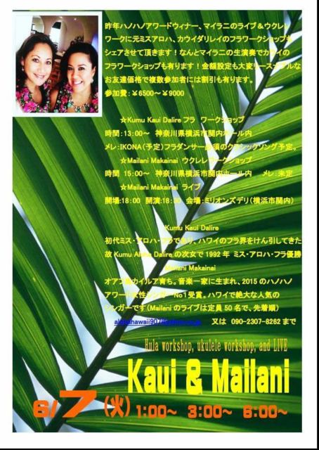 ¡úALOHA¡ú ²£ÉͤÎÄḫ¤ÇHula¥¤¥Ù¥ó¥È¤ò¼çºÅ¤·¤Æ¤ë¥³¥ß¥å¥Ë¥Æ¥£¡¼ ¡Ö¥Ï¥ï¥¤¤Î¥¯¥à¥Õ¥é¤È¥Õ¥é¥À¥ó¥¹¡×¤Ç¤¹ ¡ù6·î7Æü ²ÐÍËÆü³«ºÅ¤·¤Þ¤¹ ¡ÖKumu Kaui Dalire ¡õ singer Mailani Makainai w/s¡¦live¡×¤Î¹ðÃΤǤ¹ ºòǯ¥Ï¥Î¥Ï¥Î¥¢¥ï¡¼¥É¥¦¥£¥Ê¡¼¡¢¥Þ¥¤¥éÆó¤Î¥é¥¤¥Ö¡õ¥¦¥¯¥ì¥ì¥ï¡¼¥¯¤Ë¸µ¥ß¥¹¥¢¥í¥Ï¡¢¥«¥¦¥¤¥À¥ê¥ì¥¤¤Î¥Õ¥é¥ï¡¼¥¯¥·¥ç¥Ã¥×¤â¥·¥§¥¢¤µ¤»¤ÆÄº¤¤Þ¤¹¡ª¤Ê¤ó¤È¥Þ¥¤¥éÆó¤ÎÀ¸±éÁդǥ«¥¦¥¤¤Î¥Õ¥é¥ï¡¼¥¯¥·¥ç¥Ã¥×¤âͤê¤Þ¤¹¡ªÆüËܽé¤Î¹ë²Ú¥á¥ó¥Ð¡¼¤Ç¤Î¥Õ¥é¥ï¡¼¥¯¥·¥ç¥Ã¥×¤Ê¤Î¤ÇÀ§Èó¤´¸¡Æ¤²¼¤µ¤¤¤Í¡£¶â³ÛÀßÄê¤âÂçÊѥ꡼¥¹¥Ê¥Ö¥ë¤Ë¤Æ¥·¥§¥¢¤µ¤»¤ÆÄº
