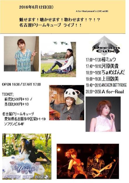 【TICKET】 (前売り)2500円+1D (当日)2800円+1D 【出演者】栫ミュウ/河原美貴/ ちょめぱんだ / 上田敦美 /ANCHEIN BETTYROSE/A for-Real 17:00~17:30 栫ミュウ 17:40~18:10 河原美貴 18:20~18:50 ちょめぱんだ 19:00~19:30 上田敦美 19:40~20:10 ANCHEIN BETTYROSE 20:20~20:50 A for-Real
