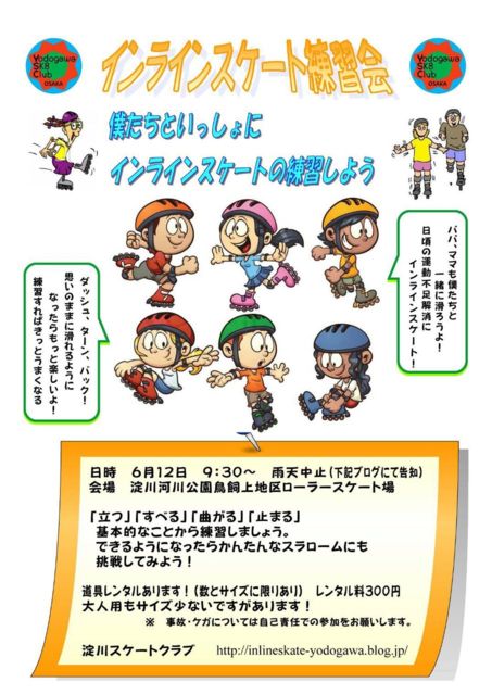 インラインスケートの練習会を開催します。 お互いにインラインスケートの情報交換をしながら練習をしましょう。 日時:2016年6月12日 9:30〜11:30 ※ 雨天中止 (前日22時までに中止判断しこのblogでお知らせします) 場所:淀川河川公園 鳥飼スケート場 ここ、淀川スケーターのコミュニティに登録したけれどなかなか滑りにくる機会がない人、最近ご無沙汰な人、インラインスケートを買ったけど滑り方がよくわからない人、いつもは一人で家族で滑ってるけど大勢で楽しみたい人、基礎から学びたい人などなど、悩みは皆んなで解決
