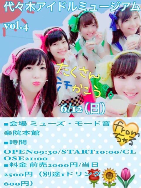 「代々木アイドルミュージアムvol.4」 日時:6/12(日) 開場09:30 開演10:00 会場:代々木 ミューズ・モード音楽院本館 料金:前売2,000円/当日2,500円(1D別600円) 出演:ハニースパイス/福永幸海/藤田恵名/AngeLip/ACATOCRO/はっぴっぴ/百々瀬愛莉/UPローチ/アンダービースティー/リーブルエール/Splash!/カプ式会社ハイパーモチベーション/おにごっ娘/佐々木まゆ/真空スペクトル/はるちろ/R-Village Girls/江織杏/campus/impression/BABY☆STAR/バーバ⁂ヤーガ/スプリングChu♡bit/ALLOVER/ヤンチャン学園/shabet/黒崎れおん/白星ウ