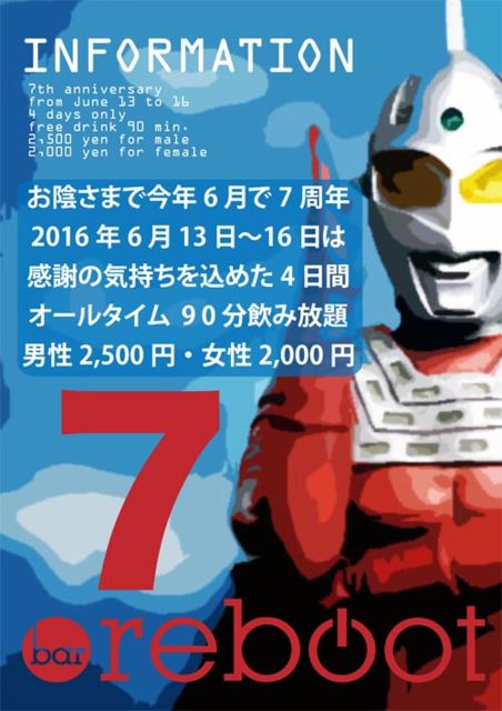 2016.6.13(mon)¡Á2016.6.16(thu)¤Î£´Æü´Ö ¡Øbar reboot £·¼þǯͤêÆñ¤¦½µ´Ö´ë²è¡Ù ¤¤¤Ä¤âÍÆñ¤¦¸æºÂ¤¤¤Þ¤¹¡£ º£·î¤Ç¥ê¥Ö¡¼¥È¤â£·¼þǯ¤ò·Þ¤¨¤Þ¤¹¡£ ¤³¤ì¤âËÜÅö¤Ë³§¤µ¤ó¤Ë»Ù¤¨¤é¤ì¤Æ¤Î»ö ¿´¤«¤é´¶¼ÕÃפ·¤Þ¤¹¡£ º£·î13Æü¤«¤é16Æü¤Î4Æü´Ö¤Ï ´¶¼Õ¤Îµ¤»ý¤Á¤ò¹þ¤á¤¿4Æü´Ö¡£ ÃËÀ2.500±ß¡¢½÷À2.000±ß¡Ê90ʬ¡Ë °û¤ßÊüÂê¥×¥é¥ó¤È¤µ¤»¤ÆÄº¤¤Þ¤¹¡£ ¤³¤ì¤«¤é¤â¥ê¥Ö¡¼¥È¤òµ¹¤·¤¯¤ª´ê¤¤Ãפ·¤Þ¤¹¡£