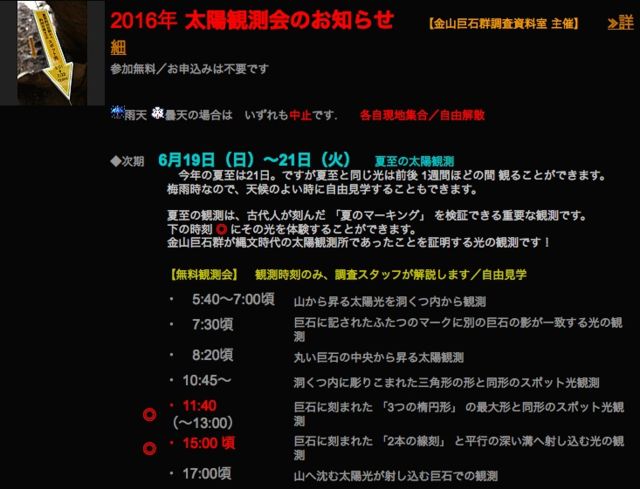 ²Æ»ê¤Î´Ñ¬¤Ï¡Ö²Æ¤ÎÀþ¹ï¡×¤ò¸¡¾Ú¤Ç¤¤ë½ÅÍפʴѬ¤Ç¤¹¡£ ¶â»³µðÀз²¤¬Æìʸ»þÂå¤ÎÂÀÍ۴Ѭ½ê¤Ç¤¢¤Ã¤¿¤³¤È¤ò¾ÚÌÀ¤¹¤ë¸÷¤Î´Ñ¬¤Ç¤¹¡ª http://www.seiryu.ne.jp/~kankou-kanayama/kyoseki/gif2/newest.html ¡¦ 5:40¡Á7:00º¢ »³¤«¤é¾º¤ëÂÀÍÛ¸÷¤òƶ¤¯¤ÄÆâ¤«¤é´Ñ¬ ¡¦ 7:30º¢ µðÀФ˵¤µ¤ì¤¿¤Õ¤¿¤Ä¤Î¥Þ¡¼¥¯¤ËÊ̤εðÀФαƤ¬°ìÃפ¹¤ë¸÷¤Î´Ñ¬ ¡¦ 8:20º¢ ´Ý¤¤µðÀФÎÃæ±û¤«¤é¾º¤ëÂÀÍ۴Ѭ ¡¦ 10:45¡Á ƶ¤¯¤ÄÆâ¤ËĦ¤ê¤³¤Þ¤ì¤¿»°³Ñ·Á¤Î·Á¤ÈƱ·Á¤Î¥¹¥Ý¥Ã¥È¸÷´Ñ¬ ¡ý 11:40¡Á13:00¡¡µðÀФ˹ï¤Þ¤ì¤¿ ¡Ö3¤Ä¤ÎÂʱ߷Á¡× ¤ÎºÇÂç·Á¤ÈƱ·Á¤Î¥¹¥Ý¥Ã¥È¸÷´Ñ¬ ¡ý