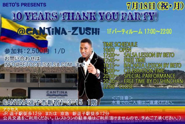 BETO Senzey 10 Years Anniversary Thank You Party! @CANTINA-ZUSHI Kaigan £··î£±£¸Æü ½ËÆü·îÍËÆü ³¤¤ÎÆü 16:00 - Open 17:00 - BETO Salsa Lesson 17:45 - Free Time 18:15 - BETO Bachata Lesson 19:00 - Celebration Time 20:00 - Special Parformance 20:30 - Free Time by DJ Shinchan 22:00 - CLOSE £²¥ì¥Ã¥¹¥ó+£±¥É¥ê¥ó¥¯ 2,500±ß info@betocalisalsa.com DJ ¤·¤ó¤Á¤ã¤ó Yokohama Salsa CANTINA Zushi ¿ÀÆàÀ¿à»Ò»Ô¿·½É£±-£³-£±£µ £±³¬¥Ñ¡¼¥Æ¥£¡¼¥ë¡¼¥à http://www.cantina-zushi.com/acces