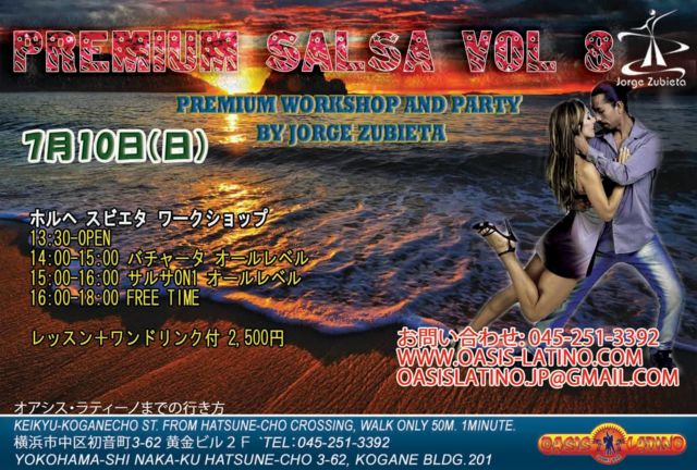 PREMIUM SALSA vol. 8 @ Oasis Latino JORGE ZUBIETA Premium Workshop and Party £··î£±£°Æü ÆüÍËÆü 13:30 - Open 14:00 - 15:00 BACHATA All Level 15:00 - 16:00 Salsa ON1 All Level 16:00 - 18:00 DJ Time £²¥ì¥Ã¥¹¥ó+£±¥É¥ê¥ó¥¯ ¡ï2,500 DJ ¤·¤ó¤Á¤ã¤ó Yokohama Salsa OASIS LATINO - Salsa en Japon ²£ÉÍ»ÔÃæ¶è½é²»Ä®3-62 ²«¶â¥Ó¥ëÆó³¬ 045-251-3392 www.oasis-latino.com oasislatino.jp@gmail.com ¡öµþÉ͵޹Ô[²«¶âÄ®±Ø]¤«¤éÅÌÊ⣱ʬ ¡ö»Ô±ÄÃϲ¼Å´[ºäÅì¶¶±Ø]¤«¤éÅÌÊ⣵ʬ µþÉ͵޹Բ«¶âÄ®