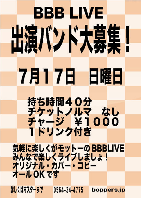 BBB LIVE ½Ð±é¥Ð¥ó¥ÉÂçÊ罸¡ª £··î£±£·Æü¡¡ÆüÍËÆü »ý¤Á»þ´Ö¡¡£´£°Ê¬ ¥Á¥±¥Ã¥È¥Î¥ë¥Þ¡¡¤Ê¤· ¥Á¥ã¡¼¥¸¡¡¡ï£±£°£°£° £±¥É¥ê¥ó¥¯ÉÕ¤ µ¤·Ú¤Ë³Ú¤·¤¯¤¬¥â¥Ã¥È¡¼¤ÎBBB LIVE ¤ß¤ó¤Ê¤Ç³Ú¤·¤¯¥é¥¤¥Ö¤·¤Þ¤·¤ç¡ª ¥ª¥ê¥¸¥Ê¥ë¡¦¥«¥Ð¡¼¡¦¥³¥Ô¡¼ ¥ª¡¼¥ëOK¤Ç¤¹ ¾Ü¤·¤¯¤Ï¥Þ¥¹¥¿¡¼¤Þ¤Ç