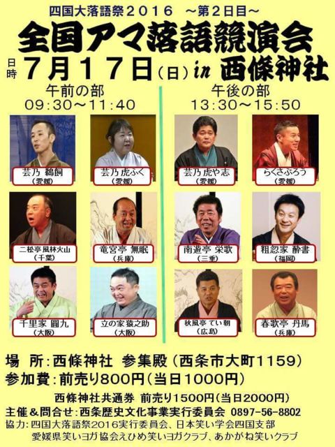 《全国アマ落語競演会in西條神社〜午前の部〜》 日時:平成28年7月17日(日)9時半〜11時半 場所:西條神社 参集殿 主催:西条神社 〒793-0030 愛媛県西条市大町1159 http://www.mapion.co.jp/smp/m2/33.90282486,133.18854471,18/v=m1: 電話:0897-56-8802 参加費:当日券1000円 前売券800円(一日券1500円) 【番組】 「平林」芸乃鵜飼(愛媛) 「家康VSメカ家康」二松亭風林火山(千葉) 「つる」芸乃虎ふく(愛媛) 「試し酒」竜宮亭無眠(兵庫) 〜仲入り〜 「金明竹」立の家猿之助(大阪) 「高津の富」千里家圓九(大阪)
