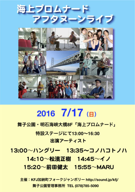 7月17日(日)舞子公園 海上プロムナードライブ 毎月第三日曜日 KFJ加納町フォークジャンボリー http://sound.jp/kfj/ 主催の 定期ライブイベント 。明石淡路海峡大橋8F 海上プロムナード http://www.hyogo-park.or.jp/maiko/contents/sisetsu/area_prom.html 特設ステージにて 13:00〜16:30無料(但し入館料 300円が必要です) ☆7月はハングリーのホストイベントライブです 13:00〜ハングリー https://www.facebook.com/%E3%83%8F%E3%83%B3%E3%82%B0%E3%83%AA%E3%83%BC-1487493964906534/ 13:35〜コノハコトノハ http://konohakoto