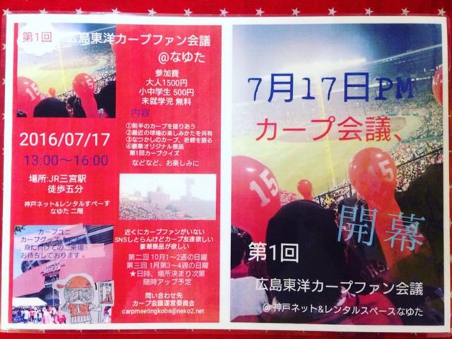 カープが好きな方、神戸・三宮に大集合! ご友人などご紹介、大歓迎です(´艸`*) カープのグッズ何かは身につけてご参加ください♡ ユニフォーム、帽子、タオル、なんでもありです 1) 「上半期のカープ」を振りかえり、語り合う 2 )カープクイズ 仁義なき戦いexclamation景品あり 日時:平成28年7月17日(日)13:00-16:00 開催場所:神戸ネット&レンタルスペースなゆた2階 会費:1500円(軽食、ソフトドリンク込み) 未就学児✱無料 小学生✱500円 備考:持ち込み自由(アルコールも可) お