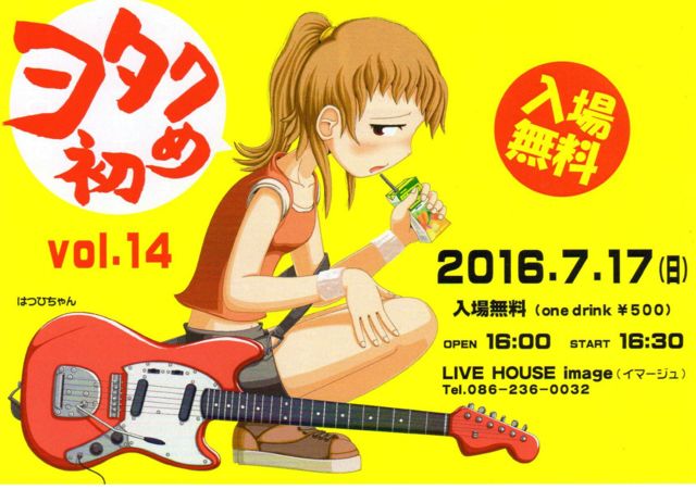情報解禁! 「ヲタク初め vol.14」の情報を遂に解禁します! 暑い夏にアツいライブで盛り上がっちゃいましょう♪ 〜 ヲタク初め vol.14 〜 LINE@ ⇒ http://line.me/ti/p/%40qxy0926d Facebook ⇒ https://www.facebook.com/wotakuzome/ 【日 時】2016.07.17(日) OPEN 16:00/START 16:30 【場 所】Live House IMAGE 岡山市北区表町1-8-48 086-236-0032 【入場料】無料 ※ドリンク代 500円が必要です 【出演者】RX-78-3 リッチドール Baumkuchen