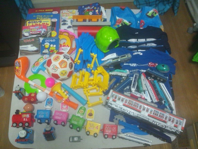 お世話になります。 おもちゃ等、全部まとめて、あげますさせて下さい。 ・送料、先にゆうちょ振込お願いします。 ・ゆうパック埼玉発。サイズは100なので、持ち込み割引100円引いて、930円〜1550円になります。 ・服は、100〜110です ・左下のアンパンマン列車、欠品あり。 ・左上のCD付の本、CD行方不明・・・。 ・電車系は、ほとんど、動かなかったり、壊れてたりするものです。 ・プラレールは、線路等のみで、電車はついていません。 ・真ん中上あたりのトーマス布。100×50くらいです。 ・梱包時、多少、増えたりする可能性