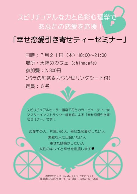 ¥¹¥Ô¥ê¥Á¥å¥¢¥ë¤ÊÎϤȿ§ºÌ¿´Íý³Ø¤Ç¤¢¤Ê¤¿¤ÎÎø¤ò±þ±ç¡ª ¡Ö¹¬¤»Îø°¦°ú¤´ó¤»¥Æ¥£¡¼¥»¥ß¥Ê¡¼¡× Æü»þ¡§7·î21Æü¡ÊÌÚ¡Ë18:00¡Á21:00 ¾ì½ê¡§Ê¡²¬»Ô¤Î¥«¥Õ¥§¡Êchinacafe¡Ë »²²ÃÈñ¡§2,300±ß ¡Ê¥Ð¥é¤Î¹ÈÃã&¥«¥¦¥ó¥»¥ê¥ó¥°¥·¡¼¥ÈÉÕ¤¡Ë Äê°÷¡§6̾¸ÂÄê ¡úÆâÍÆ¡ú Îø°¦Ãæ¤Î¿Í¡¢Êһפ¤¤Î¿Í¡¢¹¬¤»¤ÊÎø°¦¤¬¤·¤¿¤¤¿Í¤¬ÂоݤǤ¹¡ª¥¹¥Ô¥ê¥Á¥å¥¢¥ë¥Ò¡¼¥é¡¼¹Ö»Õ¤È¿§ºÌ¿´Íý³Ø¡Ê¥«¥é¡¼¥Ó¥å¡¼¥Æ¥£¡¼³Ø¡Ë¹Ö»Õ2̾¤Ë¤è¤ë¹¬¤»¤Ë¤Ê¤ì¤ë¥Æ¥£¡¼¥»¥ß¥Ê¡¼¡£ ¥¹¥Ô¥ê¥Á¥å¥¢¥ë¥Ò¡¼¥ê¥ó¥° ¡¦ÌÜŪãÀ®¥Þ¥¤¥ó¥É¤Îºî¤êÊý ¡¦¥»¥ë¥Õ¥Ò¡¼¥ê¥ó¥°Ë¡ ¡¦¤ªÇº¤ß¥ê¡¼¥Ç¥£¥ó