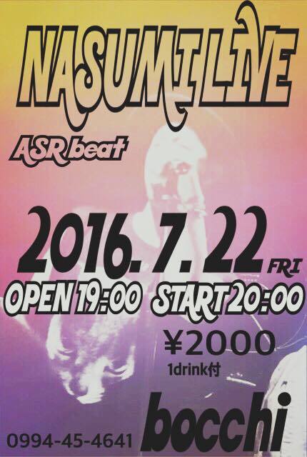 NASUMI LIVE ASR beat 2016/ 7/22 (fri) 19:00 OPEN 20:00 START \2000 (1ドリンク付) bocchi 鹿児島県鹿屋市本町4-16 中央ビル2F 0994-45-4641