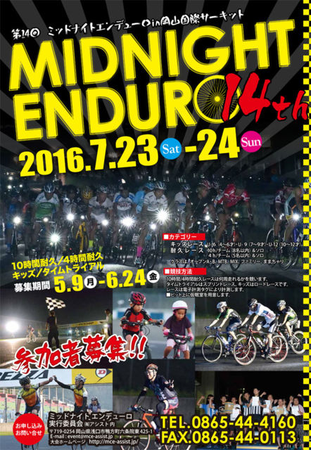 非常に急ですが、メンバー間でミッドナイトエンデューロの話が出てまして、急遽参加しようという事になりました。 チーム数、参加人数は希望者に合わせて考えたいと思いますので、出てみたい方、手を挙げてください。 参加申込みの締め切りが24日ですので、明後日まで参加者を募って申込みをします。 希望種目など、ご意見もお聞かせください。 大会の詳細はこちらをご覧ください。 http://mce-assist.jp/mned/mned_youkou.html