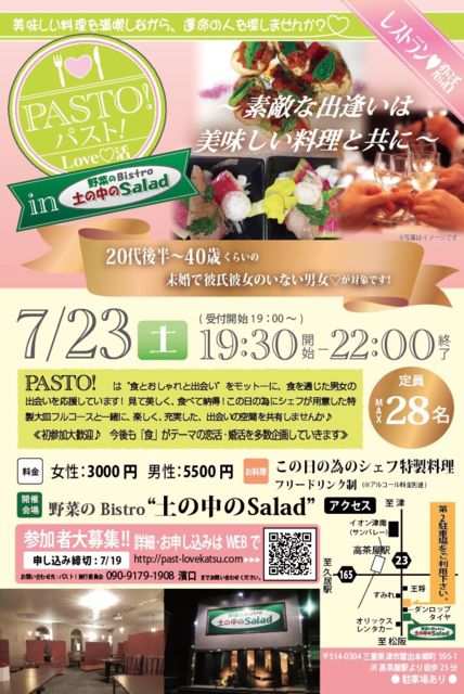 ~素敵な出逢いは美味しい料理と共に~ .。.:*・゚♡★♡゚・*:.。 。.:*・゚♡★♡゚・*:.。 LOVE♡活イベント 「PASTO! 」 .。.:*・゚♡★♡゚・*:.。 。.:*・゚♡★♡゚・*:.。 レストラン恋活はお料理も期待大! 料理に舌鼓をうちながら自然と会話が弾む空間 そんな時間を過ごしてみませんか もっと気軽に もっとお手頃に PASTO!じゃなきゃ出逢わなかった人と出逢えるかも♡ 詳しくはコチラから⇒http://past-lovekatsu.com/ *☆*☞*゚゚゚゚*a