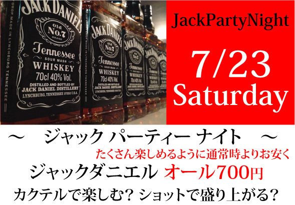 7月23日(土)18:00〜 ジャック ダニエル パーティーのお知らせです! いつもよりお安くなっています! がっつりのんで楽しんで頂けると嬉しいです(^_-)-☆