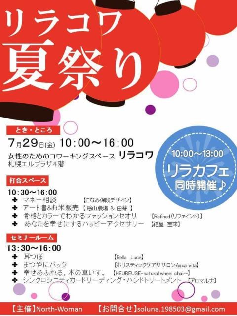 今月29日に、リラコワhttp://womenscowork.wix.com/co-working-lilaco夏祭りを開催することになり 私も シンクロニシティカードリーディングと、アロマハンド出店させていただくことになりました リラコワhttp://womenscowork.wix.com/co-working-lilacoって、3年目なんですけど、 私の周りではまだまだ、知られていないんですよねびっくり 札幌駅、近くにお出かけの方は、ちょっと足を伸ばしてください お会いできるのを楽しみに、お待ちしています
