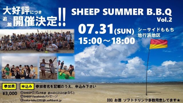 Â繥ɾ¤Ë¤Ä¤Äɲó«ºÅ·èÄê¤Ç¤¹¡ú Á°²ó³«ºÅʬ¤Ï150̾¤ÎÊý¤ËÍ·¤Ó¤ËÍè¤ÆÄº¤¤Þ¤·¤¿(*^_^*) 7/31¡ª²Æ¿¿¤ÃÂþÃæ¢ö( ¡¦È¡®)¥Î ²Æ¤È¸À¤¨¤Ð¡ª³¤¡úBBQ¡ú É´Æ»ÉͤǤߤó¤Ê¤Ç²Æ¤·¤Þ¤·¤ç¡¼¤¦¡ª »²²Ã´õ˾¼Ô¡¢À仿Êç½¸Ãæ¤Ç¤¹¡ª °Ê²¼¾ÜºÙ¤È¤Ê¤ê¤Þ¤¹¡£ ==================== SHEEP Summer B.B.Q Vol.2 ==================== ³«ºÅÆü:7/31(Æü)15:00¡Á18:00 ¾ì½ê:¥·¡¼¥µ¥¤¥É¤â¤â¤ÁÃϹÔÉÍÃ϶襪¡¼¥È¥¥ã¥ó¥×¾ì »²²ÃÈñ:\3,000 ¡ÚÈ÷¹Í¡Û ¡öBBQ¡¢¥½¥Õ¥È¥É¥ê¥ó¥¯¡¢¤ª¼ò¿¿ôÍѰդ·¤Æ¤ª¤ê¤Þ¤¹¡£ ¡ö¥¹¥¤¥«³ä¤ê¡¢¥Ó¡¼¥Á¥Õ¥é¥Ã¥°¤Ê¤ÉͽÄꤷ¤Æ¤ª¤ê¤Þ¤¹¡£ ¡ö