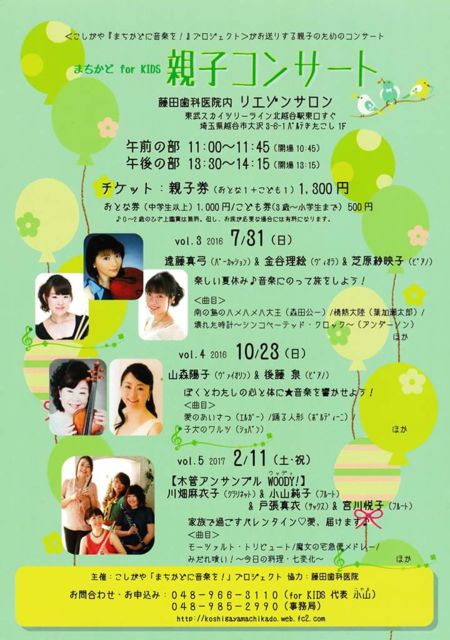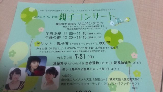 昨年もご案内させて頂きましたが、 今年度も『まちかどfor KIDS 親子コンサート』を開催します☆ 暑い夏を更に盛り上げる曲が満載です! ●7/31(日)午前の部11:00〜/午後の部13:30〜 ●北越谷藤田歯科医院内 リエゾンサロン ●親子券1300円/大人1000円/こども500円(3才〜小学生) 0・1・2才は無料です♪ 是非是非お越しください(^O^) ご連絡・ご予約、お待ちしています♪