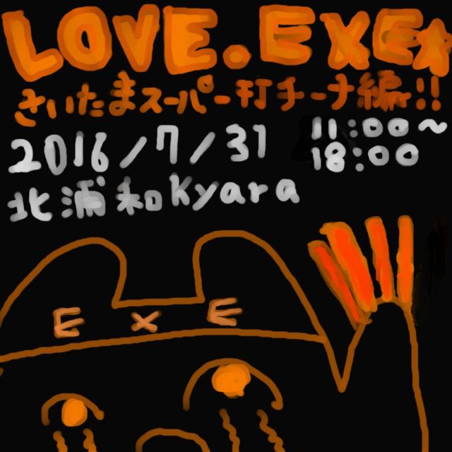 打たせろ!LOVE.EXE★ そのにじゅ〜いち! クソイベンター大集合!!! 此処が一番の夏!!! さいたまスーパー打チーナ編!!!!! 2016年7月31日 (日曜日 昼) OPEN 11:00 START11:30 CLOSE18:00 二次会 19:00 END 21:00 開催場所@埼玉県北浦和kyara http://www.livehouse-kyara.com/ 北浦和駅前!徒歩1分! 無料ロッカー36個完備! 音響ばつぐんの柵有りライブハウス! 2Fは出入り自由の飲食店あ