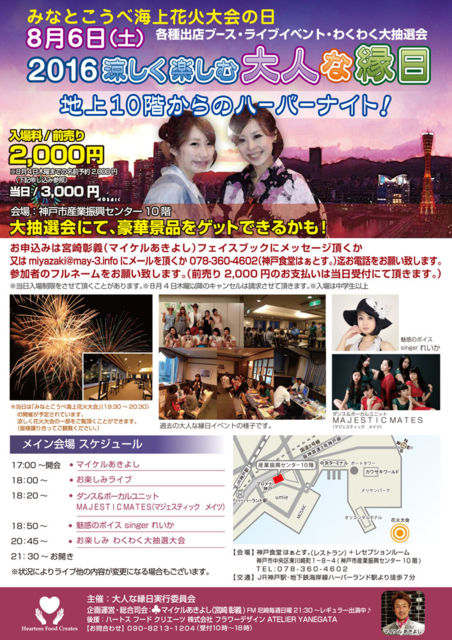 ¿ÜËá¤Î³¤´ß¤Ç¥ï¥¤¥ï¥¤¤È¥é¥¤¥Ö¤ò¤·¤¿¤¤¤Ê¤È»×¤Ã¤Æ»Ï¤á¤¿¥¹¥Þ¥µ¥Þ¤¬º£Ç¯¤Ç10²óÌܤò·Þ¤¨¤Þ¤¹¡£ ³ÆÃϤ«¤é½¸¤Þ¤Ã¤¿²»³Ú¹¥¤Ãç´Ö¤Î¥é¥¤¥Ö¥Ñ¡¼¥Æ¥£¤Ç¤¹¡£ ¤¿¤Àº£¡¢»²²Ã¼Ô¤Î¥¨¥ó¥È¥ê¡¼¤ò¼õÉÕÃæ¤Ç¤¹¡£ ¥³¥á¥ó¥È¤Ë¤ª½ñ¤¤¤¤¿¤À¤¯¤«¥á¥Ã¥»¡¼¥¸¤Ç¤´Ï¢Íí¤¯¤À¤µ¤¤¡£ Æü»þ¡¡2016/8/6¡ÊÅÚ¡Ë¡¡11:30 OPEN 12:00 START ¡Á 20:00 ¾ì½ê¡¡¥ª¡¼¥·¥ã¥ó¥Ó¥å¡¼¿ÜËá ¡¡¡¡¡¡¿À¸Í»Ô¿ÜËá¶è¼ãµÜÄ®1-1-4¡¡¿ÜËá¥è¥Ã¥È¥Ï¡¼¥Ð¡¼¥Ó¥ë£´F ¡¡¡¡¡¡TEL ¡§ 078-736-1118 ²ñÈñ¡¡1000±ß¡Ê°û¿©ÊÌ¡Ë ¡¡¡¡¡¡°û¿©Éʤλý¤Á¹þ¤ß¤Ï¤´±óθ¤¯¤À¤µ¤¤ ºÇ¶á¤ÎÅê¹Æ