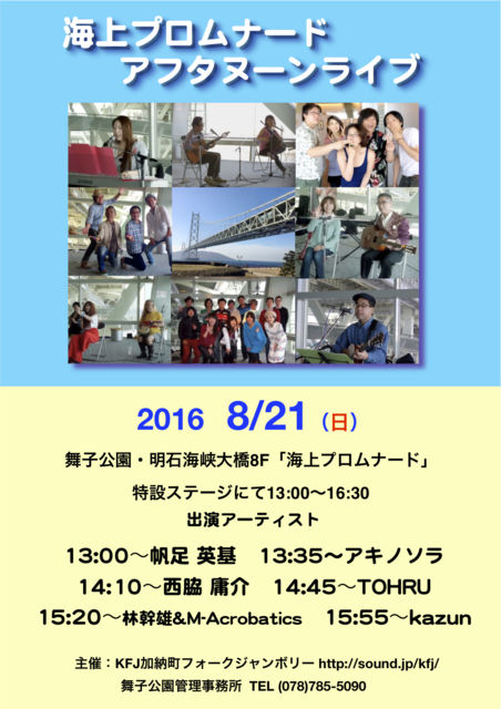 8·î21Æü¡ÊÆü¡ËÉñ»Ò¸ø±à ³¤¾å¥×¥í¥à¥Ê¡¼¥É¥é¥¤¥Ö Ëè·îÂè»°ÆüÍËÆü KFJ²ÃǼĮ¥Õ¥©¡¼¥¯¥¸¥ã¥ó¥Ü¥ê¡¼ http://sound.jp/kfj/ ¼çºÅ¤Î Äê´ü¥é¥¤¥Ö¥¤¥Ù¥ó¥È ¡£ÌÀÀÐøϩ³¤¶®Âç¶¶8F ³¤¾å¥×¥í¥à¥Ê¡¼¥É http://www.hyogo-park.or.jp/maiko/contents/sisetsu/area_prom.html ÆÃÀߥ¹¥Æ¡¼¥¸¤Ë¤Æ 13:00¡Á16:30̵ÎÁ¡Ê⤷Æþ´ÛÎÁ 300±ß¤¬É¬ÍפǤ¹¡Ë 13:00¡ÁÈÁ ±Ñ´ð¡¡http://unazukeba.wixsite.com/unazukeba-hai 13:35¡Á¥¢¥¥Î¥½¥é 14:10¡ÁÀ¾ÏÆ ÍDzð 14:45¡ÁTOHRU https://www.facebook.com/tohru.sakaguchi.3 15:20¡Á ÎÓ´´Íº&M-Acrobatics 15:55¡Á