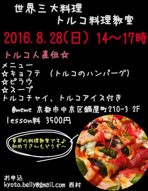 大阪ではありませんが近いですので是非に トルコ料理を作ってみませんか? トルコの料理は難しくありませんよ♡ トルコ人直伝のトルコ料理教室♪ 8月28日14:00〜17:00 メニュー ★キョフテ (トルコのハンバーグ) ★ピラウ (トルコのピラフ) ★スープ トルコチャイ、トルコアイス付き♪ レッスン料 3500円 最少催行人数5名(最大10名) 単発の料理教室なので、初めてさんも男性の方もどうぞ。 <料理教室の特徴> ・デモ形式(でも大事なところは、実習あり) ・トルコbar開催ということもあり、トルコ