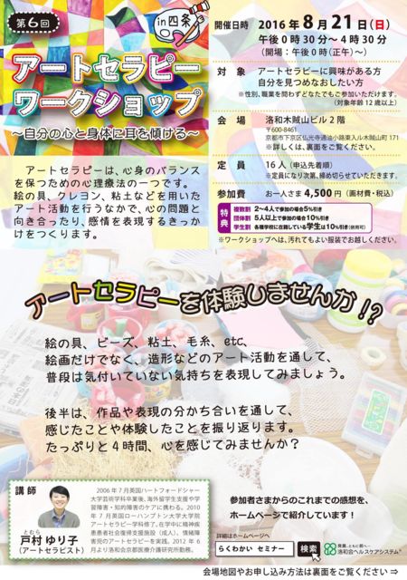 アートセラピーワークショップ in 京都 〜自分の心と身体に耳を傾ける〜 大好評につき第6回目の開催が決定! 【概要】 アートセラピーは、心身のバランスを保つための心理療法の一つです。 絵の具、クレヨン、粘土などを用いて絵画や造形活動を行うなかで、 心の問題と向き合ったり、感情を表現するきっかけをつくります。 アートセラピーを体験し、「自分の心と体に耳を傾ける」ことで、 今の自分の心身の状態や魅力についてアートから読み解く機会を持ちませんか? 【対象者】 ・アートセラピーに興味がある方 ・自分を見つ