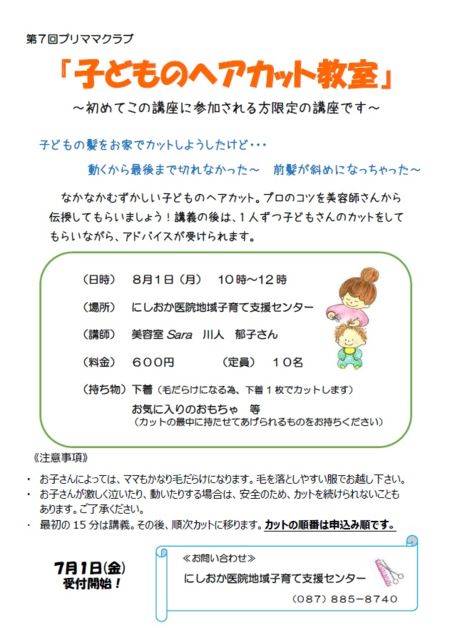 ËèǯÂ繥ɾ¤Î¡Ö»Ò¤É¤â¤Î¥Ø¥¢¥«¥Ã¥È¶µ¼¼¡×¤òº£Ç¯¤â³«ºÅ¤·¤Þ¤¹¡£ ½é¤á¤Æ¤³¤Î¹ÖºÂ¤Ë»²²Ã¤µ¤ì¤ëÊý¸ÂÄê¤Ç¡¢Äê°÷¤Ï10̾¤Ç¤¹¡£ ¥«¥Ã¥È¤Î½çÈ֤Ͽ½¤·¹þ¤ß½ç¤Ç¤¹¤Î¤Ç¡¢¤´Í½Ìó¤Ï¤ªÁá¤á¤Ë¢ö ÌÀÆü¡¢7·î1Æü¡¡9»þ¤è¤ê¡¢Í½Ì󳫻ϤǤ¹¡ª