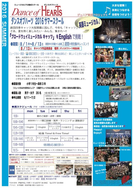 ¥À¥ó¥¹¥ª¥Ö¥Ï¡¼¥Ä¡¡2016 ¥µ¥Þ¡¼¥¹¥¯¡¼¥ë ¤µ¤¢¡¢²Æ¤òÇ®¤¯³Ú¤·¤ß¤¿¤¤¡Ä¤ß¤ó¤Ê¡¢½¸¤Þ¤ì¡Á!! ¥Ö¥í¡¼¥É¥¦¥§¥¤¥ß¥å¡¼¥¸¥«¥ë¡Ö¥¥ã¥Ã¥Ä¡×¤òEnglish¤ÇÄ©À ¡üÂ繥ɾ¤Î¥À¥ó¥¹¥ª¥Ö¥Ï¡¼¥Ä¥µ¥Þ¡¼¥¹¥¯¡¼¥ë¤¬»Ï¤Þ¤ê¤Þ¤¹¡ª ·àÃĻ͵¨¡Ö¥¥ã¥Ã¥Ä¡×Âçºå³«Ëë¤Ë°ø¤ó¤Ç¡¢ º£Ç¯¤â±Ñ¸ì¤Ç¥ß¥å¡¼¥¸¥«¥ë¡Ö¥¥ã¥Ã¥Ä¡×¤ËÄ©Àï ºÇ½ªÆü¤Ï¥Ï¡¼¥Ä¤¬¥¥ã¥Ã¥Ä¥·¥¢¥¿¡¼¤Ë¡Ä¡£ ´ü´Ö:8/1·îÍËÆü¡Á8/13ÅÚÍËÆü Ê罸¿Í¿ô:35̾ ÂоݼÔ:¾®³ØÀ¸¡Á¹â¹»À¸ ÆâÍÆ:¥Í¥¤¥Æ¥£¥Ö±Ñ¸ì¡¦¥À¥ó¥¹¡¦²Î¡¦¥ß¥å¡¼¥¸¥«¥ë¡¦ÀîÍ·¤Ó¡¦µë¿©¡¦½ÉÂê±þ±çÃÄ¡¦È¯É½²ñ¤Ê¤É