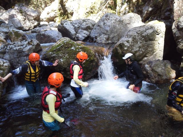 六甲山の北西にある蓬山峡(ほうざんきょう)で沢登りをします。 沢の水は冷たくて気持ちいいですよ 沢では沢専用の靴を履いて足を水に浸しながら歩きます。 水量の多い沢です。水深は一番深いところでは泳ぐことになります。 といっても深いのはごく一部で、ほとんど膝より下です。 ロープで安全確保しないといけないような滝は登りません。 また、滝が登れなくても回り道があります。 初心者歓迎 ここの岩はコケが多い感じです。 フェルト底ではないウォーターシューズはコケに弱いので、ぜひフェルト底の沢靴でお願いし