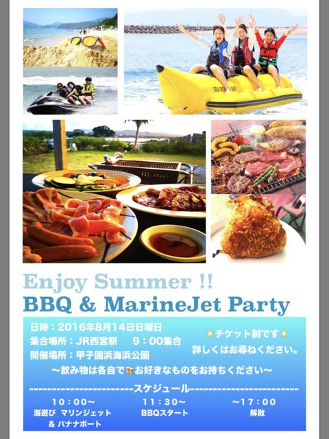 管理人様貴重なスペース失礼します。 夏だ❗ジェットだ❗BBQだ❗ ✨✨✨✨✨✨✨✨✨✨ 女性🚺特別価格緊急募集❗ ✨✨✨✨✨✨✨✨✨✨ 男性🚹も募集中❗ 初参加の方多数ですので お一人様でもお気軽にご参加ください✨ もちろんお友達と一緒にご参加も大歓迎です🌟 8月14日(日)に甲子園浜にて マリンジェット🛥& BBQ🍴 を開