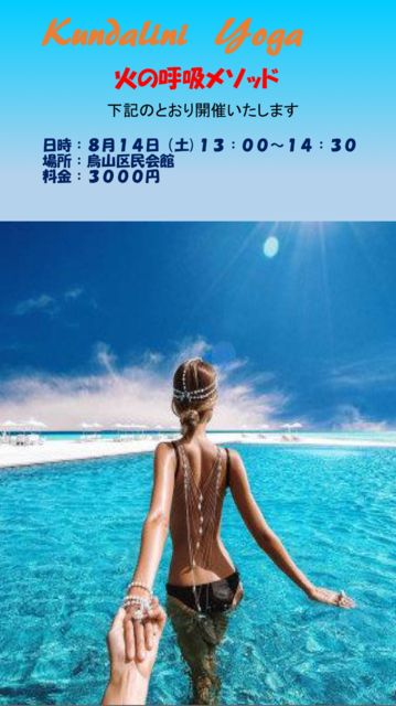 ¡ÚKUNDALINI YOGA¡Û²Ð¤Î¸ÆµÛ¥á¥½¥Ã¥É ³«ºÅ¤Î¤´°ÆÆâ ¡ÔÆâÍÆ¡Õ ¢¨Ç§Ãε¡Ç½Í½ËÉ¡¦²þÁ±¸ú²Ì¤¬¤¢¤ëâÔÁÛË¡¥¥ë¥¿¥ó¥¯¥ê¥ä ¢¨Æâ¢¤ò³èÀ²½¤·Ìþ¤·¤òÍ¿¤¨¤ë¥»¥ë¥Õ¥Á¥Í¥¤¥¶¥ó Æü»þ:8·î14Æü(ÅÚ) 13:00¡Á14:30 ¾ì½ê:±¨»³¶è̱²ñ´Û(À¤ÅÄë¶è) http://www.city.setagaya.lg.jp/shisetsu/1202/1234/d00004097.html http://teruton.wix.com/rupia