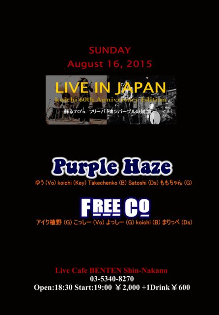 Áɤë70's¥í¥Ã¥¯¡¡Free/Bad Co./Purple¤Î¶¥±é "Live in Japan ¡É Koichi 60th Anniversary Edition 8·î16Æü(Æü)¤ËÊÛÅ·¤Ç¥é¥¤¥Ö¤ä¤ê¤Þ¤¹¡£ ¥Í¥¿¤Ï¡¢FREE¤ÈBad Co.¤Ç¤¹¡£ ¥Ð¥ó¥É̾¤Ï¡¢¥Ù¥¿¤À¤±¤ÉFree Co. ¥®¥¿¡¼¤Ï¥¢¥¤¥¯¤È¤è¤Ã¤·¡¼¡¢¥É¥é¥à¤Ï¤Þ¤ê¤Ã¤Ú¡£ ÂХХó¤Ï¡¢¥Ñ¡¼¥×¥ë•¥«¥Ð¡¼¤ÎPurple Haze¡£ ¤Ç¡¢¤³¤Ã¤·¡¼¡¢¥¢¥¤¥¯¡¢¤è¤Ã¤·¡¼¤ÎÂç³Ø»þÂå¤Î¥¯¥é¥Ö¤Î¸åÇڤǡ¢¥Ö¥ë¡¼¥¹¥í¥Ã¥¯¡¦¥»¥Ã¥·¥ç¥ó¤Ë¤¤¤Ä¤âÍè¤Æ¤¯¤ì¤ëKoichi¤¬¥ï¥·¤é¤Ç¤Ï¥Ù¡¼¥¹¡¢Purple Haze¤Ç¤Ï¥ª¥ë¥¬¥ó¤Ç¤Ò¤È¤êÂХХ󤹡£ »×¤¤¤Ã¤¤ê70ǯÂå½éƬ¥Ö¥ê¥Æ¥£¥Ã¥·¥å¤Ê¥é¥¤¥Ö¤Ç¤¹¤è¡Á ¡Ú