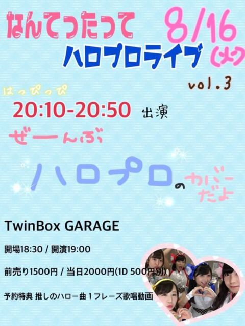 ¡Ö¤Ê¤ó¤Æ¤Ã¤¿¤Ã¤Æ¥Ï¥í¥×¥í¥é¥¤¥Ö vol.3¡× Æü»þ¡§8/16(²Ð) ³«¾ì18:30/³«±é19:00 ²ñ¾ì¡§½©ÍÕ¸¶ TwinBox GARAGE ÎÁ¶â¡§Á°Çä1,500±ß/ÅöÆü2,000±ß¡Ê1DÊÌ¡Ë ½Ð±é¡§CAMOUFLAGE¡¢¥À¥¤¥ä¥â¥ó¥É¥ë¥Õ¥£¡¼¡¢¤Ï¤Ã¤Ô¤Ã¤Ô¡¢¤à¤¹¤Ó¥º¥à¡ÊÁªÈ´¡Ë/¡Ä