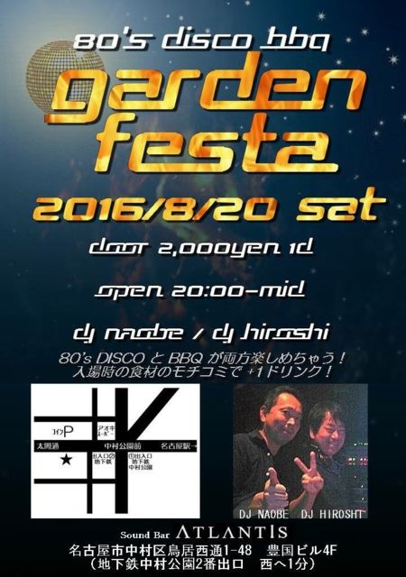 ´ÉÍý¿ÍÍÍ¡¢¹ðÃμºÎ餤¤¿¤·¤Þ¤¹¡£ 8·î20Æü¡ÊÅÚ¡Ë80's¡¡DISCO¡¡GARDEN¡¡FESTA¡¡³«ºÅ¡ª 80ǯÂå¤ÎHi-NRG¡¢EUROBEAT¡¢MTV·Ï¤òÃæ¿´¤Ë¡ª ²û¤«¤·¤ÎSOUND¤ò¤ªÆÏ¤±¤·¤Þ¤¹¡ª ¥À¥ó¥¹¥Õ¥í¥¢¤«¤é°ìÊâ³°¤Ø½Ð¤ë¤È¤½¤³¤Ë¤ÏÀ±¶õ¤ÎBBQ¥¬¡¼¥Ç¥ó¤òÊ»Àß¡ª ºÇ¹â¤Î²»³Ú¤È¡ªºÇ¹â¤ÎÃç´Ö¤È¡ªºÇ¹â¤ÎÀ±¶õ¤Ç¡ªºÇ¹â¤Î»þ´Ö¤ò¡ª ¿©ºà¤â¤´ÍѰդ¤¤¿¤·¤Þ¤¹¤¬¿ô¤Ë¸Â¤ê¤¬¤´¤¶¤¤¤Þ¤¹¡£ ¶á¤¯¤Ë¥¹¡¼¥Ñ¡¼¤â¤´¤¶¤¤¤Þ¤¹¤Î¤Ç¿©ºà¤Î¥â¥Á¥³¥ß¤Ï¤´¼«Í³¤Ë¡ª¡ª Æþ¾ì»þ¤Î¿©ºà¤Î¤ª¥â¥Á¥³¥ß¤Ç1D¥µ¡¼¥Ó¥¹¤µ¤»¤ÆÄº¤¤Þ¤¹¡ª... ¾°¡¢¥É¥ê¥ó¥¯¤Î¤ª¥â¥Á¥³¥ß¤Ï¤´±óθ¤¯¤À¤µ¤¤¡£ DATE¡¡ 8/20¡¡