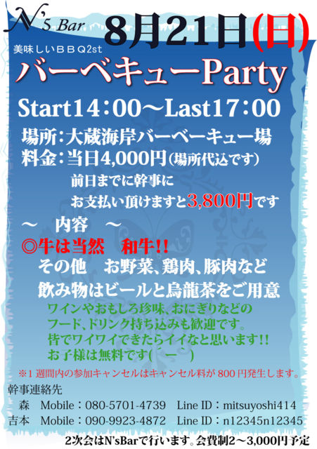 N'sBar´ë²è ¥Ð¡¼¥Ù¥¥å¡¼¥Ñ¡¼¥Æ¥£¡¼¤Î¤ªÍ¶¤¤¤Ç¤¹¡Ê¡¦¢Ï¡¦¡Ë ¥Ð¡¼¥Ù¥¥å¡¼Party¡¡¡ÁÈþÌ£¤·¤¤£Â£Â£Ñ¡Á ¾ì½ê ¥Ð¡¼¥Ù¥¥å¡¼¥µ¥¤¥È ¥Ö¥Ã¥ê¥¸¥Æ¥é¥¹Âç¢ ¡ÊÂ碳¤´ß¡Ë º½»þ·×Æü»þ 8·î21Æü(Æü) ¡¡Start£±4:£°£°¡¡¡Á¡¡Last£±7:£°£° ÎÁ¶â 4,000±ß¡Ê¾ì½êÂåÅù¹þ¤Ç¤¹¡Ë Á°Æü¤Þ¤Ç¤Ë¤ªÅ¹¤Ë¤ª±Û¤·¤ÎÊý¤Ï¤½¤ÎºÝ¤Ë´´»ö¤Î¥Þ¥¹¥¿¡¼¤Ë¤ª»Ùʧ¤¤Äº¤±¤Þ¤¹¤È½õ¤«¤ê¤Þ¤¹m(_ _)m £Á£´¥é¥ó¥¯°Ê¾å¤ÎÈþÌ£¤·¤¤µíÆù²´µíºÂ¤ò¤´ÍѰդ·¤Æ¤ª¤ê¤Þ¤¹ ¤½¤Î¾¡¡¤ªÌîºÚ¡¢·ÜÆù¡¢ÆÚÆù¤Ê¤É ¥Ó¡¼¥ë°û¤ßʪ¤Ï¥Ó¡¼¥ë¤È±¨Î¶Ãã¤ò¤´ÍѰÕ(¡¡¼¡®)£â