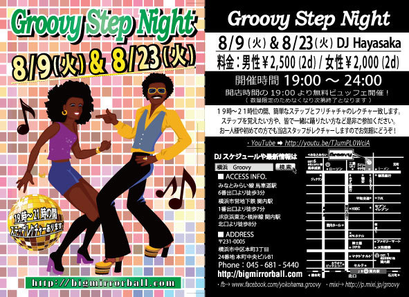 第2・第4の火曜日は【Groovy STEP NIGHT】19時〜21時位の間、簡単なフリーチャチャステップのレクチャーあります! 初心者の方、お一人様でも、当店スタッフがご対応させて頂きますのでどうぞお気軽にご参加ください♪ 【動画】 http://youtu.be/TJumPL0WciA http://youtu.be/jfhrY1yxn-A http://youtu.be/xJEb3mrihDc 【DJ】Hayasaka 【音楽】ALL MIX (21時位からは通常のDISCO TIMEになります。リクエストにも出来る限りお応えいたしますのでDJまでお気軽にどうぞ♪) 【開催時間】 19:00〜24:00 【料金】 男性:¥2,500/