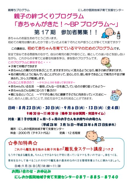 第17期 親子の絆づくりプログラム「赤ちゃんがきた!〜BPプログラム〜」の参加者募集のお知らせです。 この講座は4回連続講座で、初めて赤ちゃんを育てているママのためのプログラムです。 今回の対象者は、初めてのお子さんが平成28年3月16日〜6月23日までに生まれたママです。 一生で一度しか受けられないプログラムなので、対象の方は、是非ご参加下さいね♪