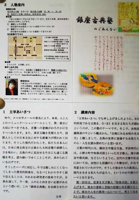 急展開の日程ではございますが、銀座で古典文学の塾を開講したいと思い立ちました! 「古典にみる女性の生き方」と題してラインナップするこの企画。 第一回目は「和泉式部」。 和歌の天才と謳われる和泉式部の光と影に迫りたいと思います。 講師は、柴田まさみ(八洲学園大学公開講座・(株)カルチャー講師) 「古人の言葉と心に立返り、未来の自分に活かしましょう!東京五輪を見据える今、国際人としての日本文化に関わる教養が求められています。」 8月23日(火)13時30分〜15時30分頃 銀座レンタル和室を予定していま