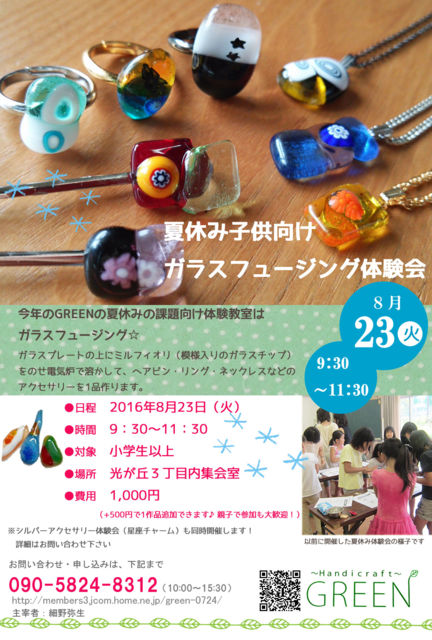 GREENホソノ 管理人 様 貴重なスペースお借りします。 こんにちは、練馬区光が丘でシルバーアートクレイ・ジュエルDeCoReの教室を主催しておりますHandicraft GREENの 細野と申します。 ___________________________ 夏休みの子供向けガラスフュージング体験会♪のお知らせ ___________________________ ご好評につき、今年も開催決定しました。 今年は、ガラスのフュージャリングをみんなで一緒に体験しましょう!! ガラスのプレートの上にミルフ