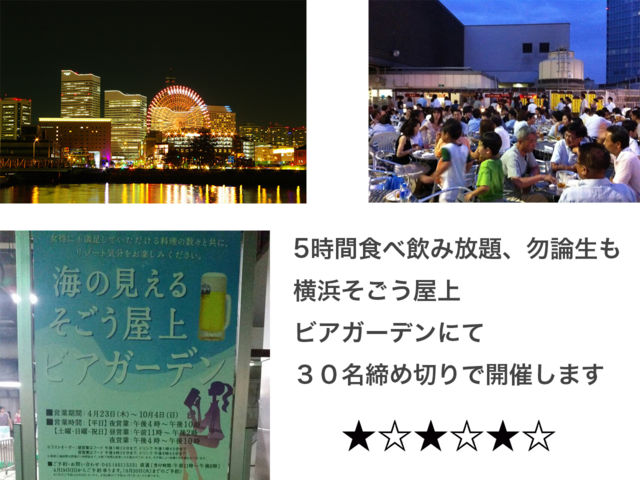 横浜そごうの屋上でビアガーデン最高でしょ★ この間なら食べ方だ飲み放題です★ 途中参加も途中退席も可 ● いきなりは不安て方は、参加者さん用のLineぐるちゃもあります☆彡 参加表明から、当日まで、そこでどんな雰囲気かわかってもらえるかと思います☆彡 希望者のみですので、管理人までお問い合わせ下さいね☆彡 集合場所 横浜そごう、屋上で16時45−55分集合 場所 横浜そごう屋上ビアガーデン