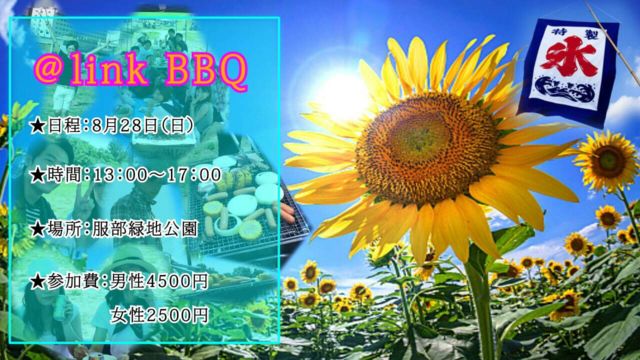 BBQで楽しく、美味しく交流をしませんかー?( ´ ▽ ` )ノ 大勢で一緒にお肉焼きながら、飲みながら、仲良くなれる人気企画です! 日時 8月28日(日) 受付12:30〜 開始13:00〜16:00 場所 服部緑地公園のBBQ会場 http://hattori.osaka-park.or.jp/guide/parkguide/taniai ※最寄り駅は「緑地公園」駅 北大阪急行(御堂筋線直通) 形式 ・180分飲み放題、BBQ食べ放題 ・スイカ割りあり♪みんなでスイカ割りゲームを実施!終了後は全員でスイカ