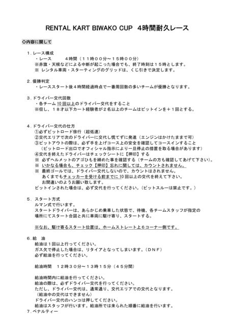 8/28(日)琵琶湖スポーツランド(滋賀県大津市)にて開催される 「レンタルカート 4H耐久レース」に参加して頂ける方を大募集中です! 1チーム最大10名で、何度もドライバー交代しながら4時間を走りきり 周回数を競う耐久レースです。 毎回、約20チームが参戦します。 我々のチームは「スーパーアプリレーシング」といいまして 今回が5回目のチャレンジとなります。 前回は2チームに分けて参戦しました結果↓ Aチーム(本気)→4位 Bチーム(遊び)→最下位! 今回も前回同様、本気と遊びの2チームで参戦予定です。 遊