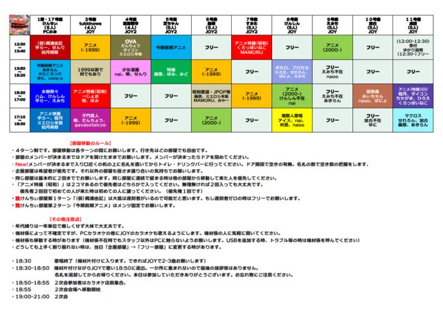 ¤³¤Î½Õ¤Ç¥ª¥Õ²ñ¤ò³«»Ï¤·¤Æ¤«¤é16ǯÌܤȤʤê¤Þ¤¹¡£ ¥×¥ì¥ß¥¢¥àÂçÉô²°¤ÇºÇ¿·µ¡¼ï£Ä£Á£Í¡¡£×£Á£Ï¡ª¤Ç²Î¤¤¤Þ¤»¤ó¤«¡© ¡ú¥¢¥Ë¥«¥éALL¥«¥é¥ª¥±¤Ç²Î¤¤»Ï¤á¤Ç¤¹¡£ ¡¡Âç¹¥¤­¤Ê¥¢¥Ë¥á¡¢ÆÃ»£¡¢¥²¡¼¥à¥½¥ó¥°¤ò²Î¤¤¤Þ¤·¤ç¤¦¡£ ¡¡1¡¥¤ªÂê¤Î1¶Ê(³«»Ï¡Á¡¡»²²Ã»þ1¶ÊÌÜ¡Ë ¡¡¡¡¤Þ¤â¤Ê¤¯½Õ¤Ê¤Î¤Ç¡¢¥¢¥Ë¥á¤Î¥¿¥¤¥È¥ë¤äÅоì¿Íʪ¡¢¶Ê¤Î¥¿¥¤¥È¥ë̾¤ä²Î»ì¤Ë¡Ö½Õ¡×¡Öºù¡×¡Ö¿·³Ø´ü¡×¡Ö¿·ÆþÀ¸¡×¤¬Ã夯¶Ê¤ò²Î¤¤¤Þ¤·¤ç¤¦¡£ ¡¡¡¡1¶ÊÌܲξ§¸å¤Ë̾Á°¤ò¸æ´ê¤¤¤·¤Þ¤¹¡£ ¡¡2¡¥¥¢¥Ë¥«¥éALL¥«¥é¥ª¥±(2¶ÊÌܰʹߡÁ15»þº¢¤Þ¤Ç) ¡¡3¡¥µÙ·Æ¡¢º£¸å¤ÎͽÄê(µÙ¤ß¤òÆþ¤ì¤Ê¤¤¾ì¹ç¤â¤¢¤ê
